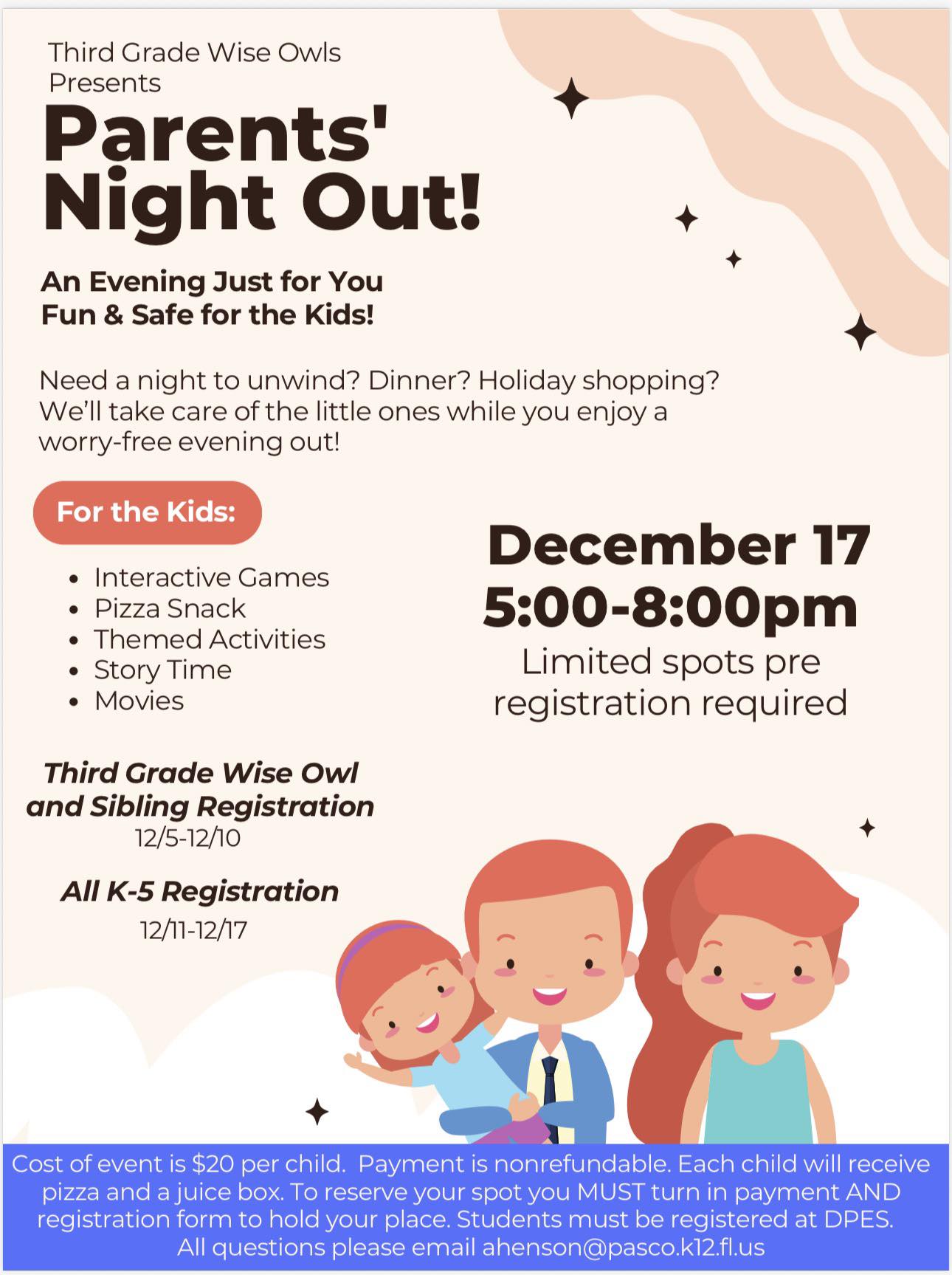 Hey Parents! The Third Grade, Wise Owls Team, is hosting a Parents' Night Out Fundraiser on Wednesday, December 17th from 5-8pm! Parents can register their child and drop them off to hangout with the third grade team while parents have a night on their own. Cost of the event is $20 and includes pizza, juice, games, crafts and more!